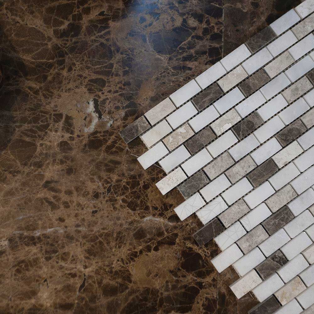 Mozaic Marmura Mix (Emperador/Tundra/Mugla) se livreaza cu dimensiunile 3.2 x 1.5 cm, finisaj polisat.