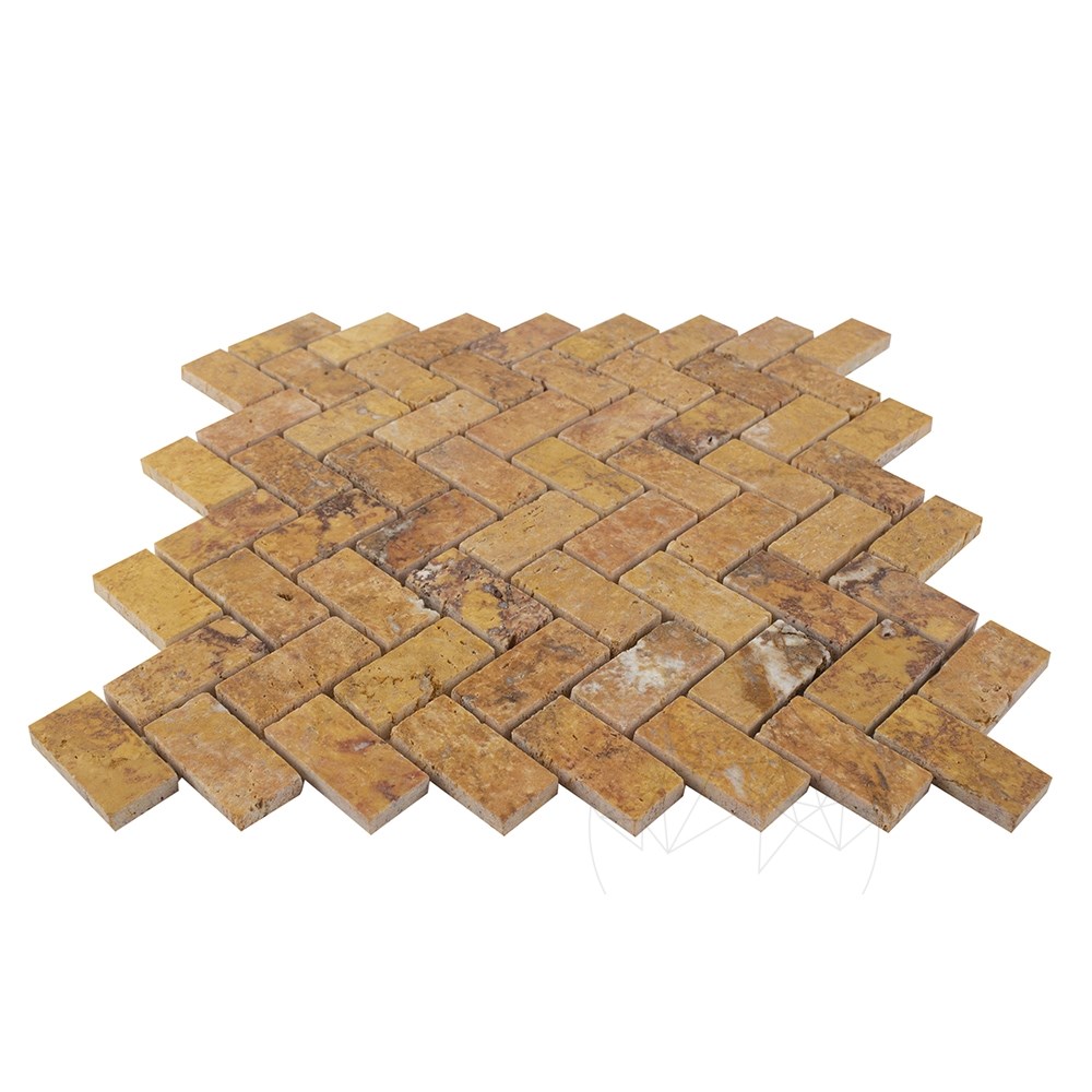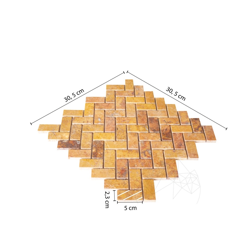Mozaic travertin Peach Herringbone se livreaza cu dimensiunile 2.5 x 5 cm, finisaj polisat. Mozaicul se executa din bucati de piatra lipite flexibil pe o plasa. Se folosesc ardezie, marmura, travertin, onix, iar pietrele componente au diverse dimensiuni, forma si culori. Montajul se face cu adeziv, cu sau fara rosturi. Adezivi de folosit: Weberset ST 10; Weberset h1O; Stone, din clasa de aderenta C1 si EX25 Max², Portelanat Max; Marmo Plus, din clasa C2.