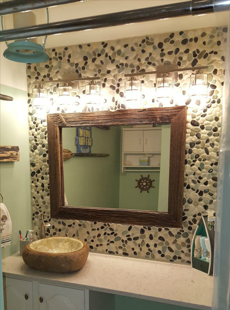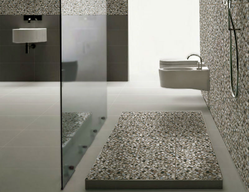 Bineinteles, continuand traditia, mozaicurile din pebble se utilizeaza foarte mult in bai. Aceste pietre sparg monotonia unei amenajari, ii dau personalitate, cu ele puteti pune in practica cel mai ”nebunesc” plan al unui designer sau propria idee. Pebble inseamna, inainte de toate, libertate de creatie: puteti acoperi o bucata dintr-un perete, un perete intreg, o pardoseala sau o portiune din ea, folosind contururi rectangulare sau curbe.