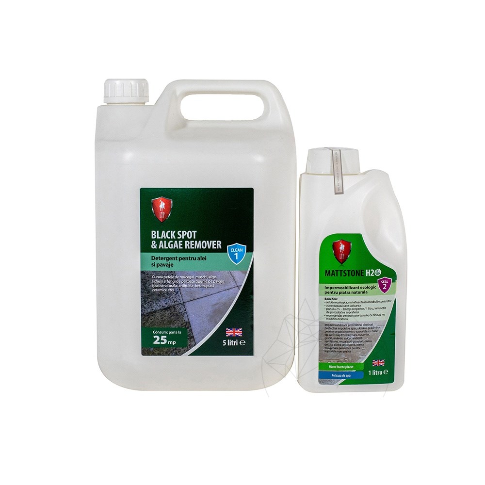 Solutia profesionala pentru suprafetele din beton, piatra, caramida sau ceramica, indiferent de finisaj. Curata, protejeaza si previne aparitia petelor de mucegai, licheni, sau muschi. In plus, reda aspectul peretilor vechi si umezi, care se usuca greu. Pachetul CLEANPAV include un LTP Black Spot & Algae Remover (detergent) si pas final LTP Mattstone H2O (impermeabilizant puternic, neutru).