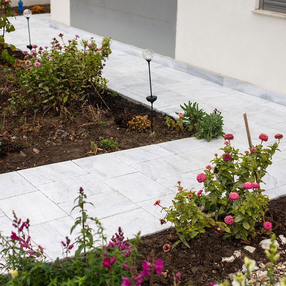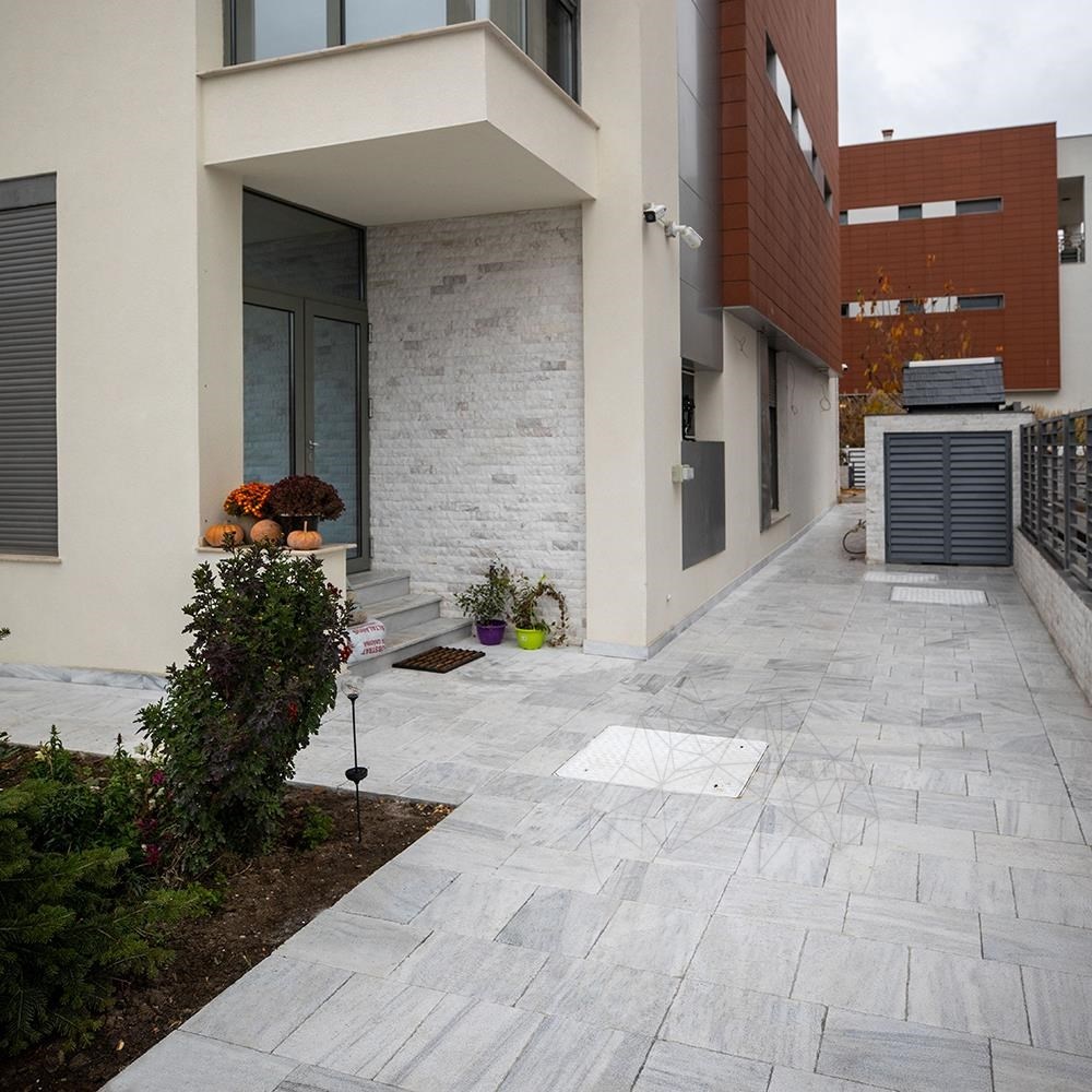 Cand vine vorba despre amenajarea curtii sau a gradinii, ia in calcul pavarea cu piatra cubica din marmura, un produs care nu numai ca aduce un plus de farmec spatiului, dar rezolva si importante probleme de utilitate. De o rezistenta si un rafinament nemaintalnite, piatra cubica din marmura Kavala cu finisaj buceardat poate fi folosita in pavarea gradinilor, a aleilor, a teraselor acoperite si neacoperite, a locurilor de parcare, atat in spatiile private, cat si in cele publice. In spatiile publice, piatra cubica din marmura Kavala este potrivita pentru aleile de parc, ronduri, piatete, acolo unde exista trafic mediu si intens. Acest material se monteaza ca orice alta piatra cubica: pe pat de nisip/pietris sau pe sapa semi-umeda si se rostuieste cu nisip fin sau cu lapte de ciment. Suprafata buceardata subliniaza naturaletea pietrei. In cazul marmurei Kavala Cross Cut, acest finisaj buceardat descopera o combinatie unica intre caracterul brut al pietrei si delicatetea ei. In plus este vorba si de o cromatica speciala, bazata pe tonuri de alb-gri variate. Astfel, placile de marmura Kavala Buceardata infrumuseteaza intr-un mod inedit atat amenjarile exterioare, cat si cele interioare. Datorita finisajului, in spatiile interioare, aceste placi se folosesc doar vertical, conferind proiectelor un aer neconventional, potrivite pentru proiecte moderne, provocatoare. In amenajarile exterioare, aceste placi cu grosimea de 4.5 cm uimesc, fiind folosite la placarea orizontala a teraselor, pavajelor, piscinelor, aleilor etc.