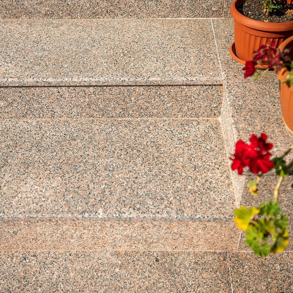 Piesele speciale din granit Santa Rosa cu finisaj fiamat completeaza intreaga colectie de produse din granit Santa Rosa. Datorita coloritului bogat si al finisajului fiamat, aceste piese speciale te surprind in cele mai neasteptate feluri. De ce? Coloritul aduna pe placa nuante de roz, negru, gri si bej, iar finisajul fiamat il face potrivit chiar si pentru spatiile umede.  Fiamarea este un procedeu prin care piatra naturala este supusa arderii la o temperatura de 2000 de grade Celsius, astfel ca ea capata o suprafata rugoasa. In urma acestui procedeu, smaltul granitului sare, iar placa inregistreaza o variatie a grosimii de 1-5 mm. Acest granit se poate folosi in nenumarate spatii, atat in intimitatea casei tale, cat si in spatiile publice, in baie, bucatarie, pentru blaturi, glafuri, trepte si contratrepte etc. Granitul Santa Rosa este de o calitate exceptionala, fiind rezistent si usor de asociat din punct de vedere cromatic cu alte elemente de decor.