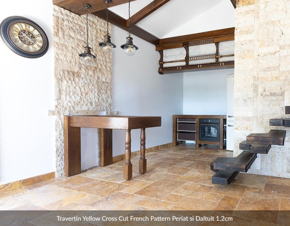 Daca iti doresti sa transformi o incapere banala intr-una memorabila, adauga un perete accent din travertin sau din alt tip de piatra naturala. Acesta poate fi in zona de luat masa, in dreptul semineului din living, in spatele patului din dormitor, in baie sau pe casa scarii. Daca ai folosit mobilier si elemete din lemn inchis la culoare, opteaza pentru placi cu nuante luminoase, precum auriu, crem sau gri deschis. Pentru un efect 3D, alege produse riflate, scapitate, rizate sau periate si daltuite.