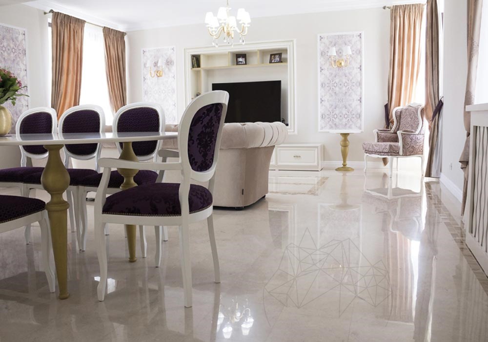 В дизайне гостиных все чаще обращаются к тенденциям возврата к форме старых люстр с отделкой из меди и латуни, а также к невстраиваемым системам освещения. Мрамор Тасос — замечательный вариант для подчеркивания архаичного характера дизайна гостиной. То же самое касается и полированного травертина Classic , который благодаря своим спокойным и нежным цветам привносит гармонию и равновесие в гостиную.