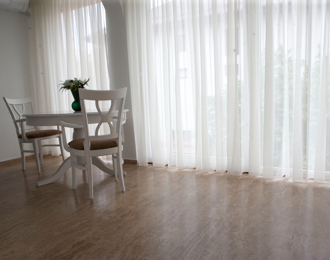 Это один из лучших вариантов напольного покрытия в обеденной зоне, особенно в классическом стиле. В случае с этим натуральным камнем отверстия в структуре камня больше не