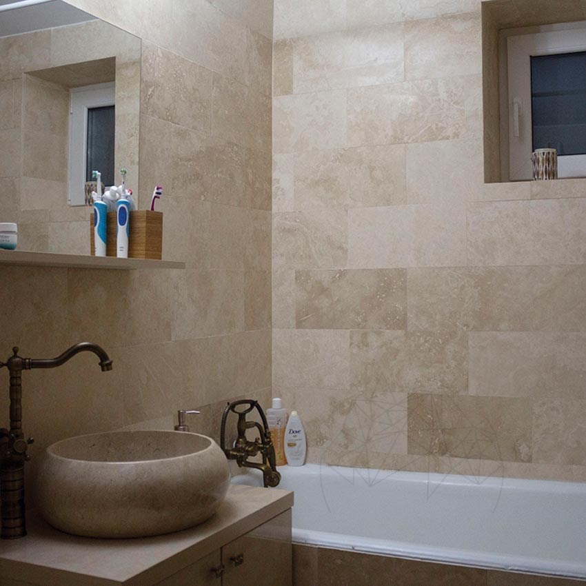 1. Отдельная ванная комната и совместный санузел - натуральный камень используется в горизонтальной (полы) и вертикальной (стены) облицовке, в исполнении душевых поддонов и ванн. Столешницы и мойки изготовлены из натурального камня. Основные требования, которые необходимо соблюдать при облицовке ванных комнат натуральным камнем: