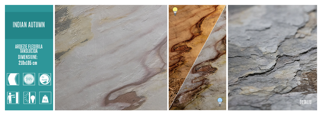 Источник света за гибким сланцем создаст уникальный и эффектный рисунок, тем более, что рисунок «Индийская осень» имеет свою собственную историю, которую он рассказывает посредством своих текстур и цветов. Этот полупрозрачный материал придаст помещению изысканность благодаря изяществу своей текстуры, придав ему другой облик. Гибкий полупрозрачный сланец Indian Autumn устойчив к огню (несгораемый материал), солнцу и воде, а также является гипоаллергенным. Также очень важна его уменьшенная толщина — 1,5–3 мм, отсюда его малый вес, что облегчает его сборку и транспортировку. Пластичность материала не меняется, а его применение остается практически безграничным — вертикальные планировки в ванных комнатах, кухнях, а также в общественных местах.