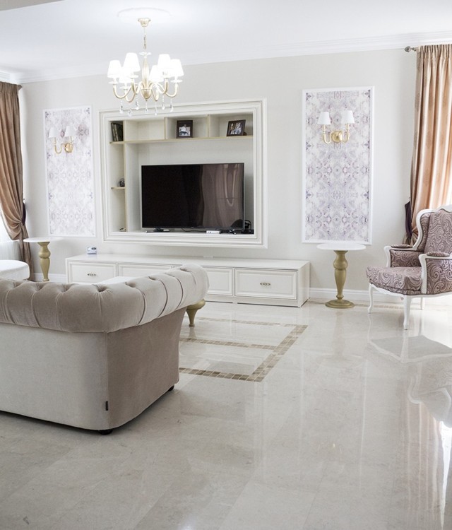 Prima data trebuie sa atacam din nou prejudecata care spune ca piatra este un produs rece ce nu se potriveste pentru placarea pardoselii. Absolut gresit! Piatra naturala este un foarte bun conducator termic. Dovada? In natura, pietrele raman calde inca mult timp dupa apusul soarelui. Intr-un living in care s-a pus gresie pe jos, este de ajuns sa deschizi o data usa de la intrare si gresia se va raci in scurt timp. Daca mai adaugam la aceasta caracteristica extrem de utila a pietrei naturale si posibilitatea de a avea azi instalatie de incalzire in pardoseala la niste preturi rezonabile, atunci ne lamurim pe deplin de eroarea pe care o fac cei care nu vor sa utilizeze piatra naturala la placarea podelelor. Un alt avantaj al pietrei naturale in amenajarea livingului - vorbind tot de pardoseala - este faptul ca exista placi patrate cu latura de 61 cm care pot deschide foarte mult spatiul, facandu-l sa para mai mare. Tipurile de piatra destinate pardoselii sunt: marmura, travertinul, granitul, calcar, ardezie, onix – sub diferite forme si finisaje.