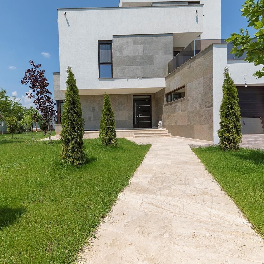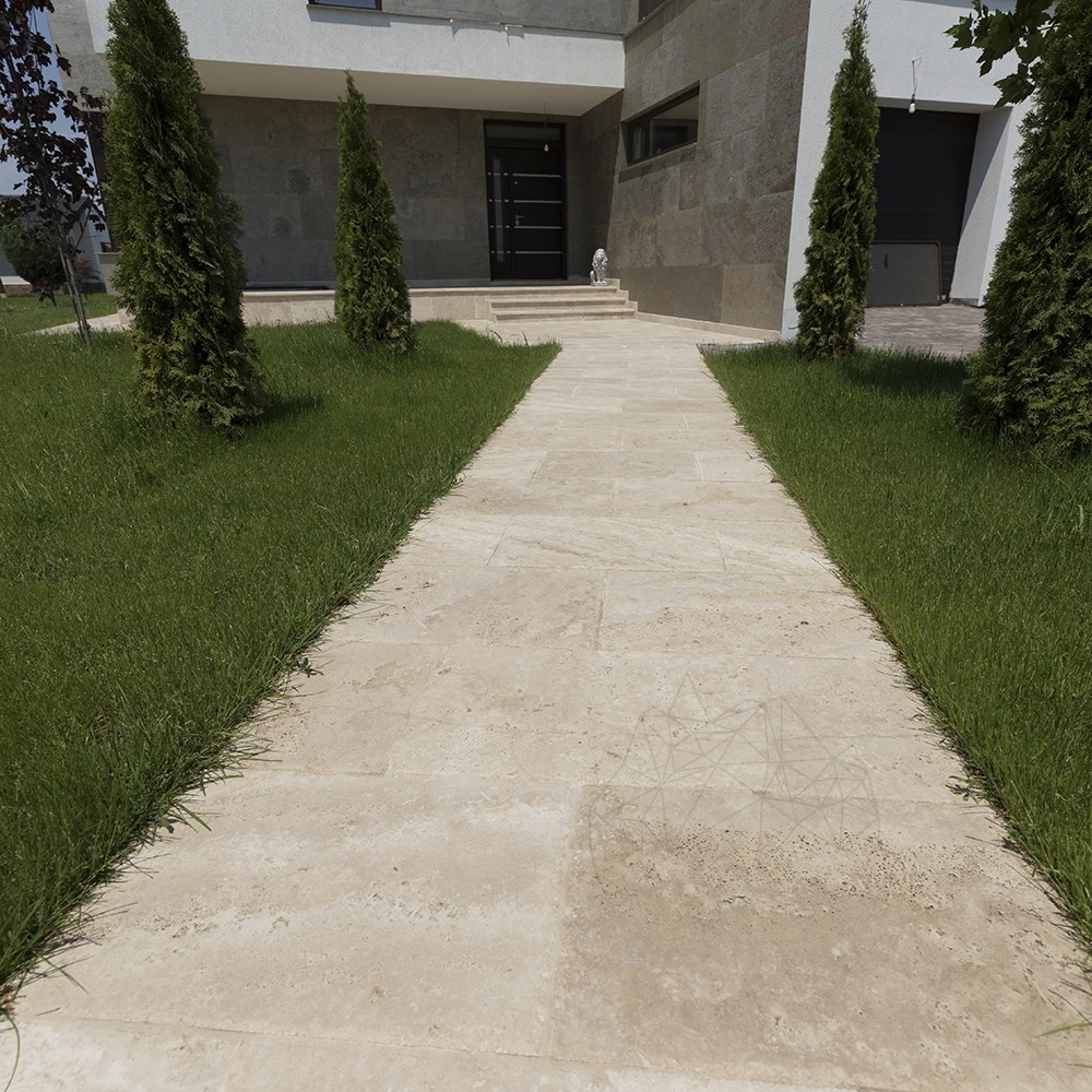 Descopera superbul Travertin Classic cu finisaj periat, recomandat pentru placarea teraselor sau a aleilor pietonale. Acest produs poate fi folosit direct pe pamant pe post de pas japonez, singura cerinta fiind stratul de nisip asezat inainte.