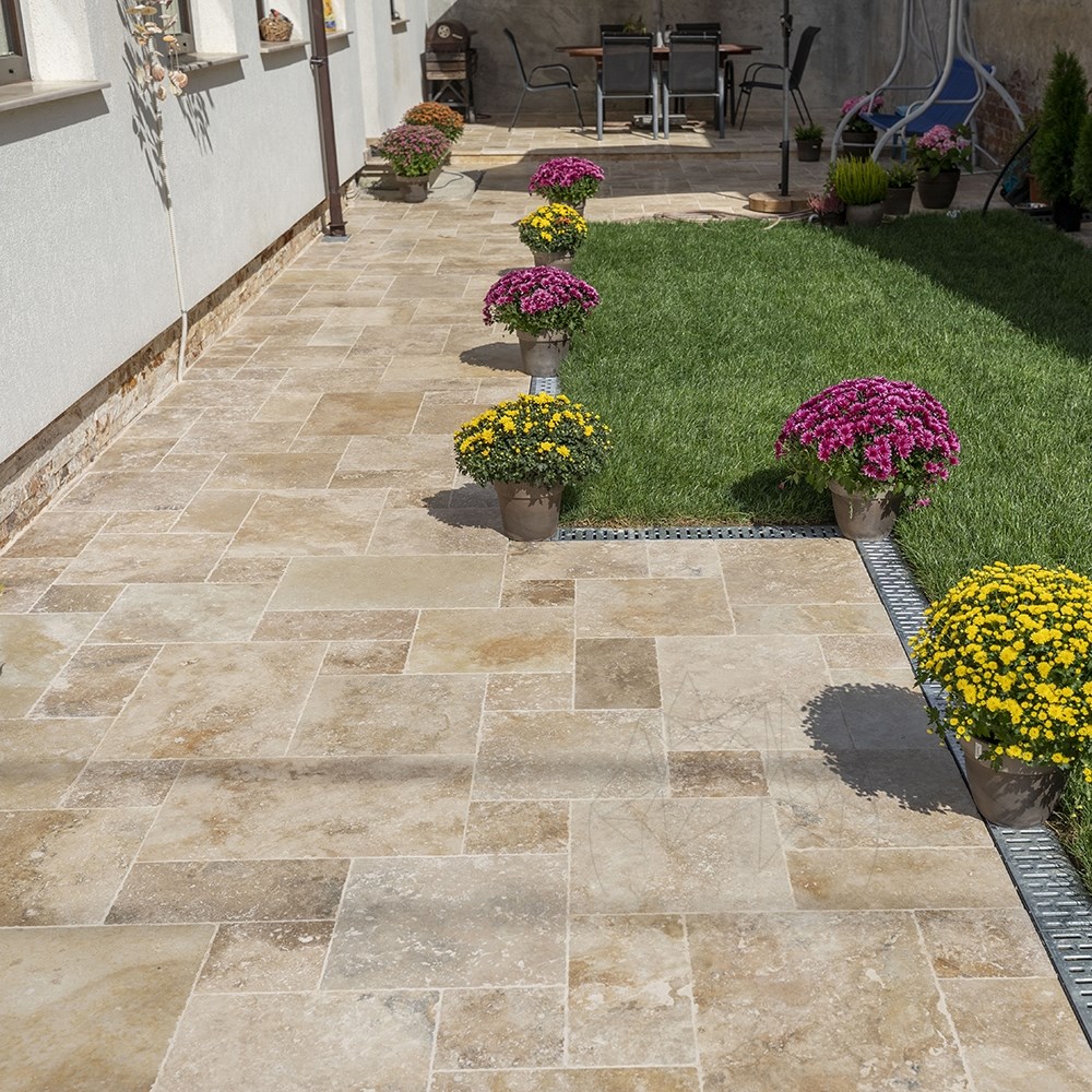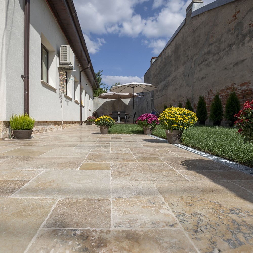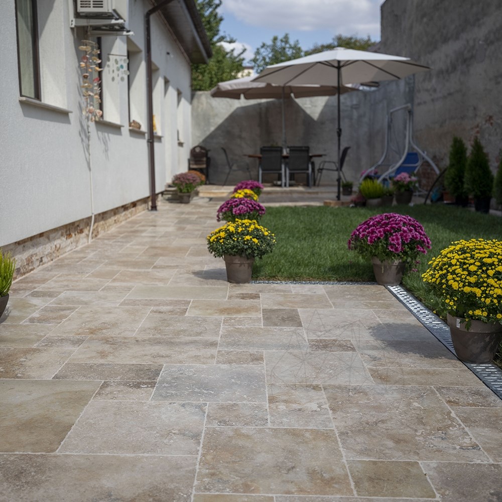 Da, grosimea de 3 cm asigură rezistență la uzură și condiții climatice extreme, travertinul fiind ideal pentru alei, terase și curți.