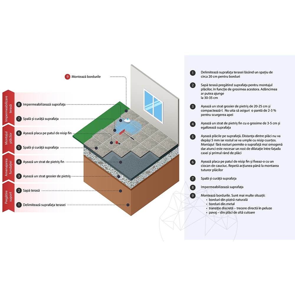 Pentru fixarea placilor, se recomanda folosirea adezivului Weber Set Marmo Plus, un adeziv flexibil cu priza rapida care se preteaza la exterior;