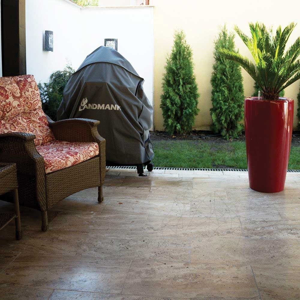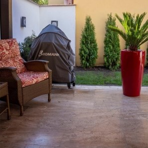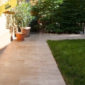 Te poti folosi de eleganta si prestanta travertinului Latte periat, chiar si in amenajarile exterioare: placari de garduri, fatade, socluri, la construirea de ancadramente pentru usi sau ferestre etc. Dimensiunea placilor de 30.5 x 61 cm scurteaza foarte mult timpul de montaj, fapt care se va simti cu precadere in cazul folosirii acestui produs la acoperirea unor suprafete mari.