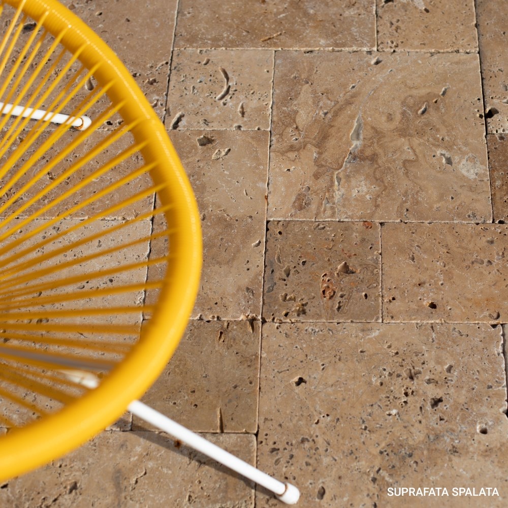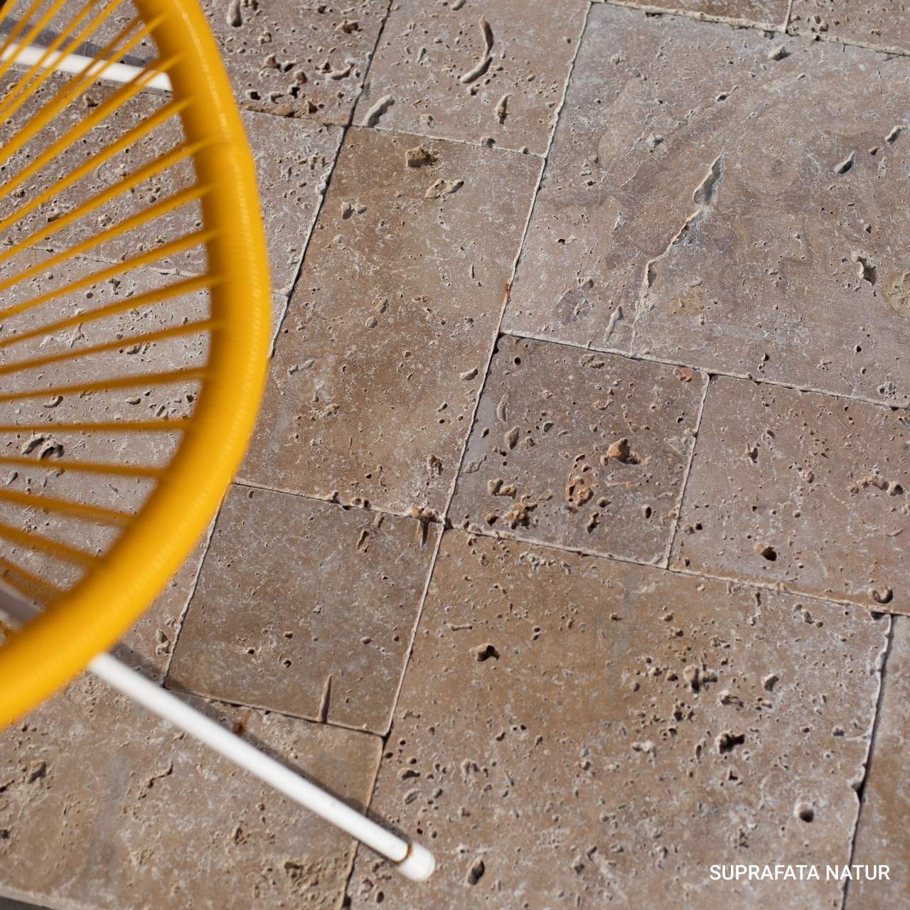 Placile travertin Noce model Mini French Pattern cu grosime de 3 cm, sunt folosite ca material de constructie pentru placari orizontale la exterior pe terase, podeste, intrari, parcuri si gradini.