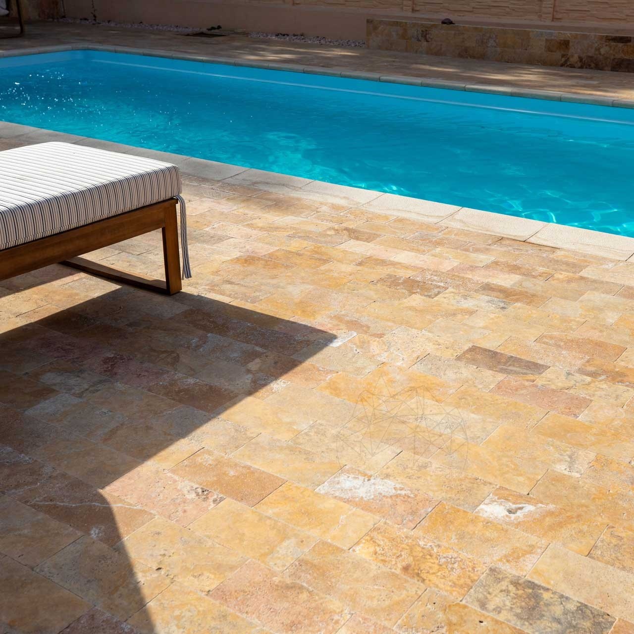 Pavajul exprima nu doar o armonizare cu mediul inconjurator, ci si o marca a personalitatii fiecaruia. Noua gama de pavaj din travertin Yellow Cross Cut antichizat cu grosimea de 3 cm, indeplineste cu succes acest rol. Recomandat pentru spatii exterioare cu trafic mediu, acest produs rezistent impresioneaza prin culoare si textura atunci cand este folosit la realizarea aleilor pietonale, a parcarilor si chiar a centurilor din jurul piscinelor. Datorita dimensiunilor placilor (30.5 x 15.2 x 3 cm), travertinul Yellow Cross Cut cu finisaj antichizat poate fi montat in diferite aranjamente, care pot crea modele atractive, ingenioase, puse in valoare prin varietatea cromatica a fiecarei placi in parte. De exemplu, se poate asorta armonios cu o casa placata cu travertin in nuante diferite (Classic, Latte, Yellow etc.). Desi cel mai adesea pavajul din travertin Yellow Cross Cut este utilizat in amenajari de tip mediteraneean sau rustic, acesta se potriveste si constructiilor cu tenta eleganta, clasica, pentru ca potentialul acestui produs consta intr-o combinatie unica de rafinament si jovialitate.