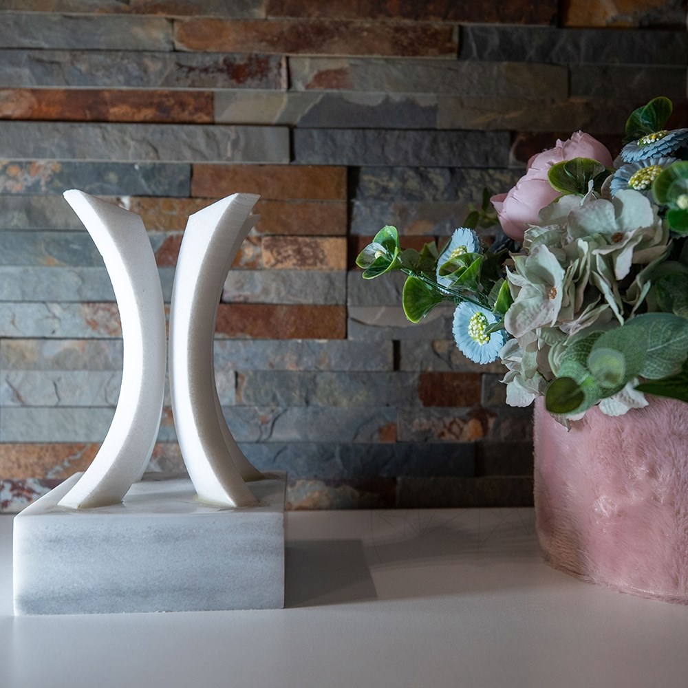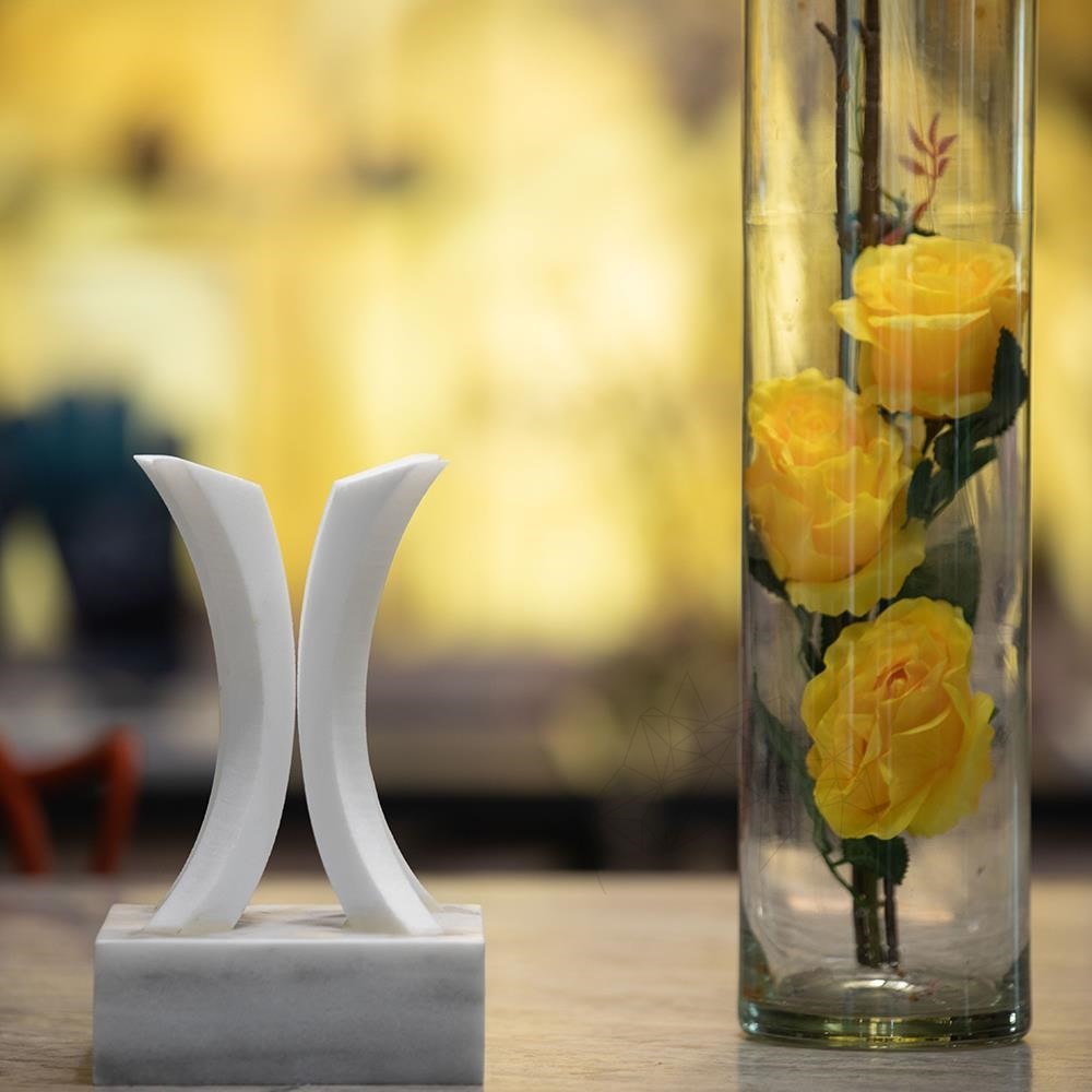 Trofeul este realizat din marmura intr-o linie de design moderna. Reprezentand un “manunchi” de coloane, forma lui simetrica sugereaza perfectiunea devenirii. Constructia pleaca din pamant si pare a se continua catre cer, intr-o simbolistica amintind de “Coloana Infinitului” a lui Brancusi. Un snop continand spice din piatra, armonios in asezarea lui, pare a marca punctele cardinale, al caror sprijin este. Si in aceasta continuitate, asociata tariei milenare a pietrei, este incastrat, distins si simplu, mesajul premiului.
