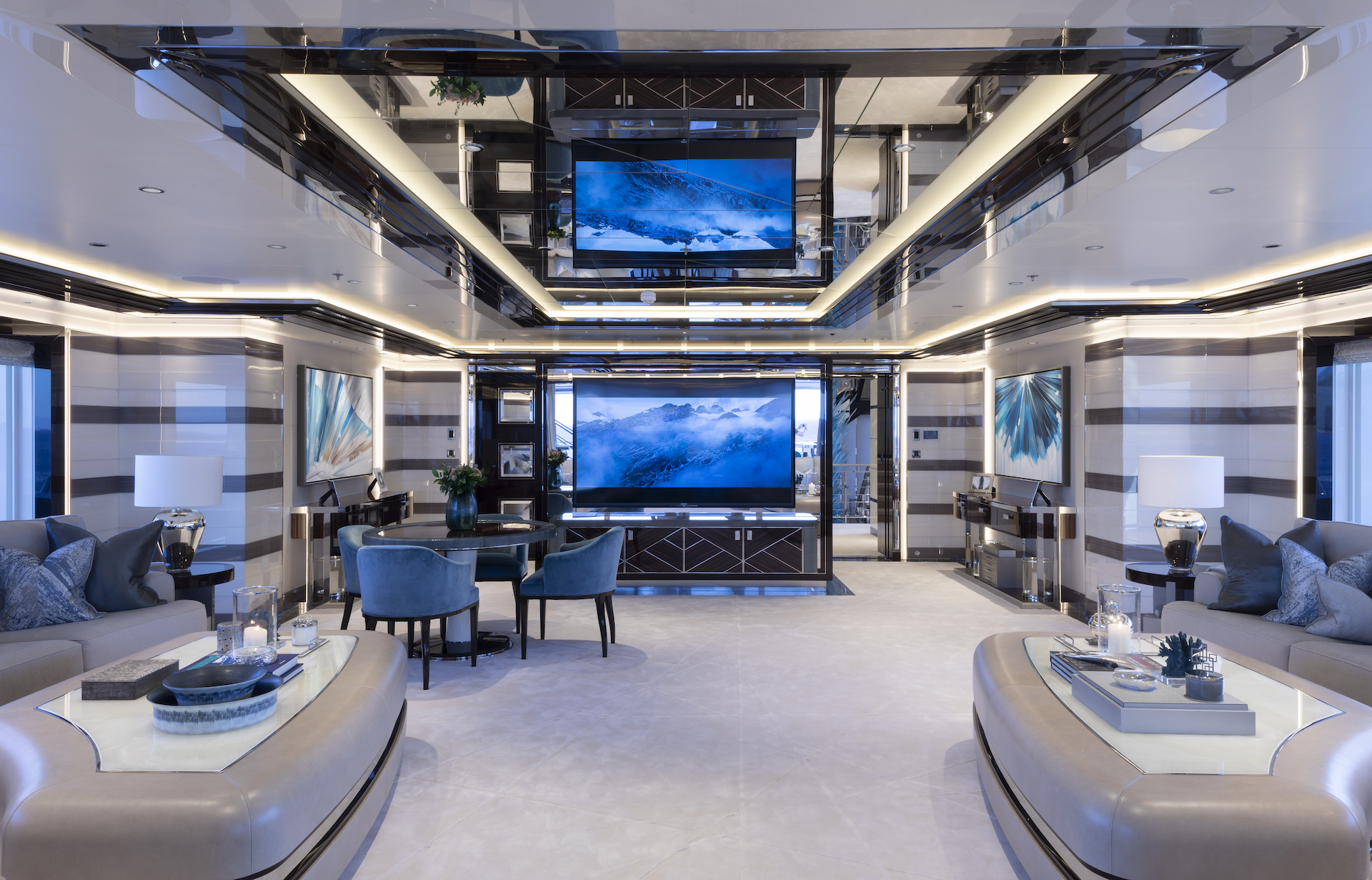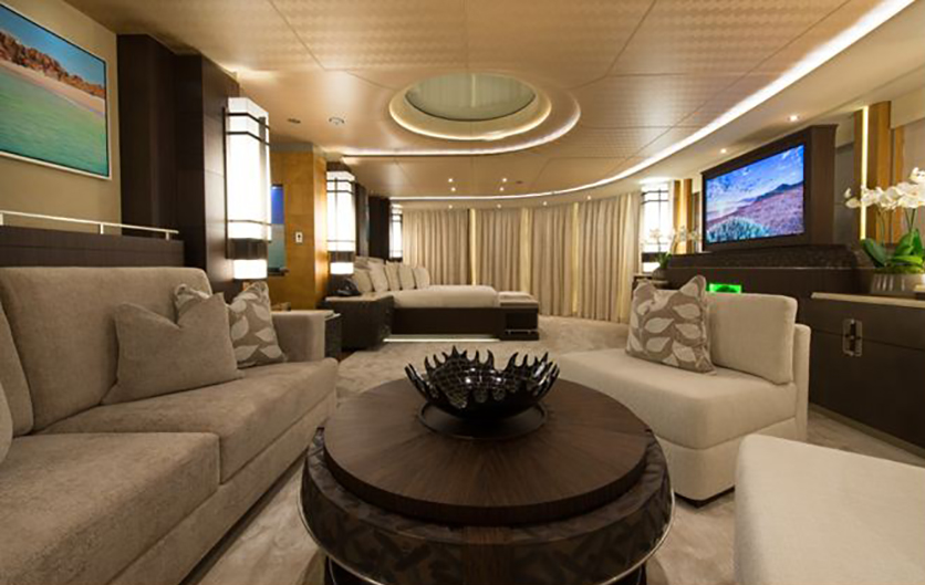 Elementele distinctive sunt puntile largi pentru distractie si relaxare, multiplele optiuni de dining-room, doua helipad-uri generoase si o gama larga de jocuri cu apa. Pe interior predomina lemnul de esenta usoara, suprafetele lacuite si marmura deschisa la culoare.